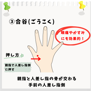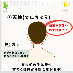 ①肩井(けんせい) ②天柱(てんちゅう) ③合谷(ごうこく) 以上の3つになります!