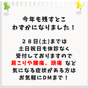 12月28日(土)の9時~12時が今年最後の診療となります!